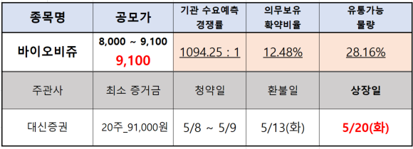 5월8일(목)~9일(금) 일반 청약 하는 바이오비쥬 공모주 입니다.