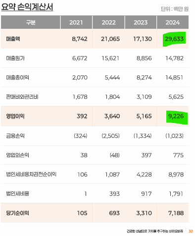 24년 매출액 296억 / 영업이익92.3 최근 4개년 흑자 지속