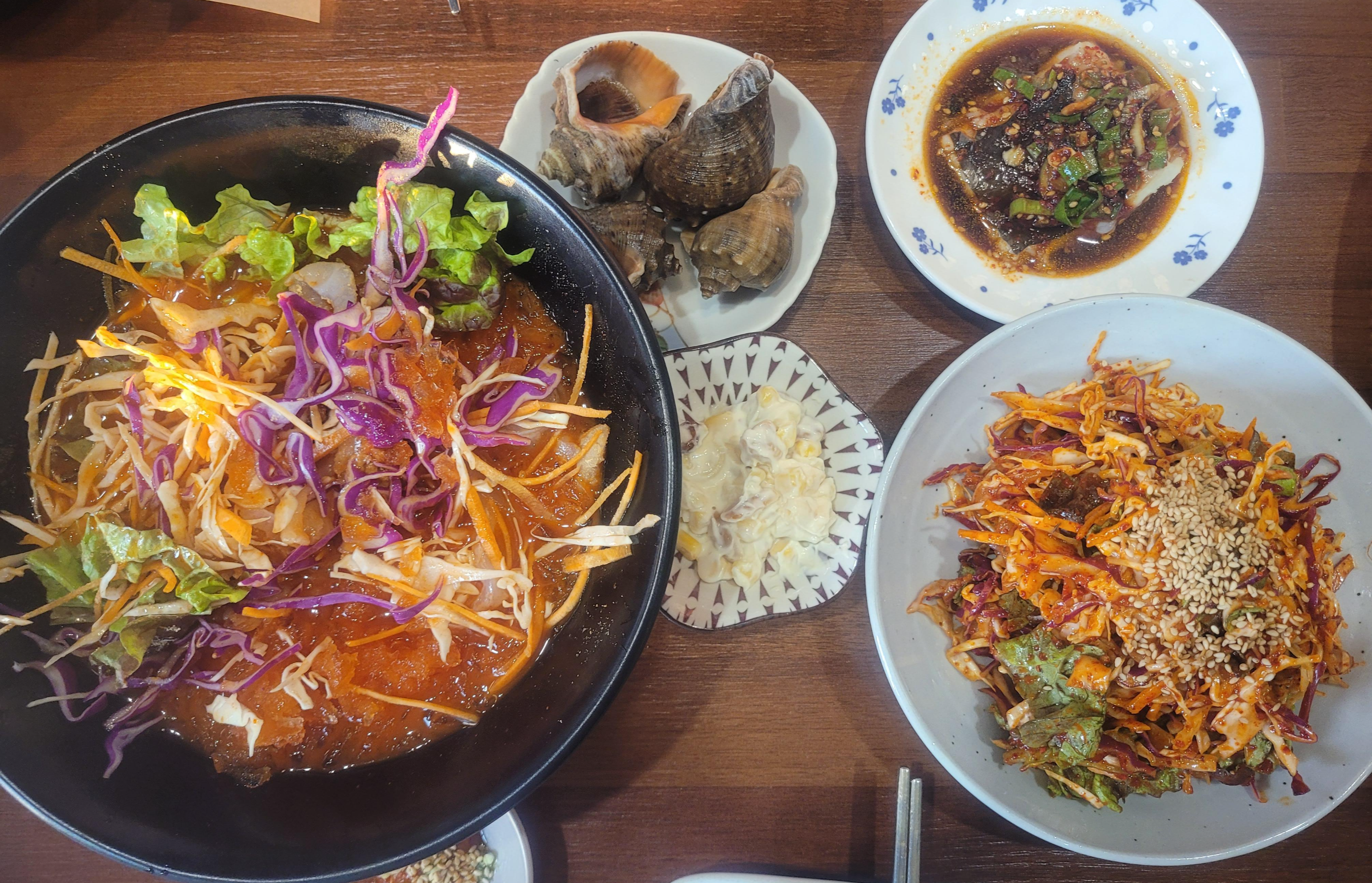 물회, 낙지, 전복, 소라, 해삼, 멍게등.. 신선한 해산물 위주로 제공됩니다.