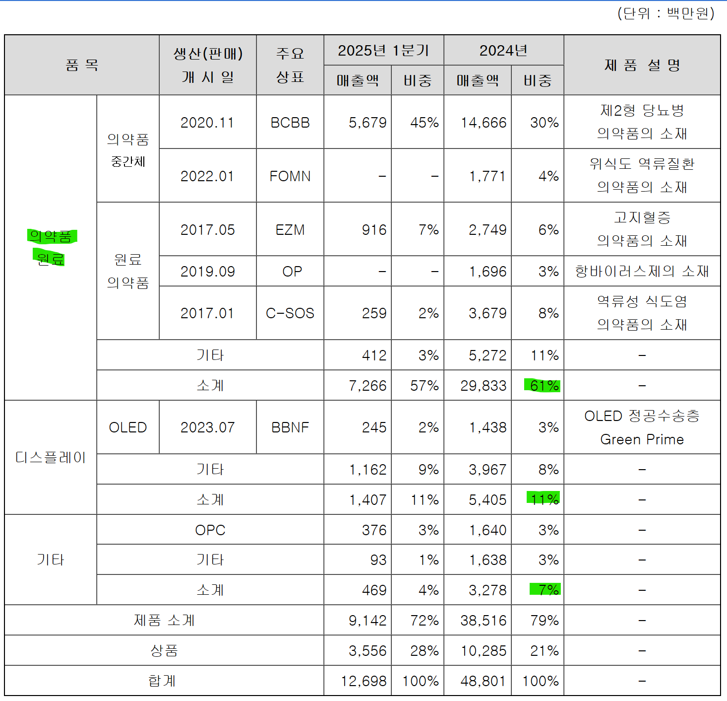 의약품 소재 주력 제품은 만성질환 (당뇨병, 역류성 식도염, 독감, 고지혈증) 적용 제품
