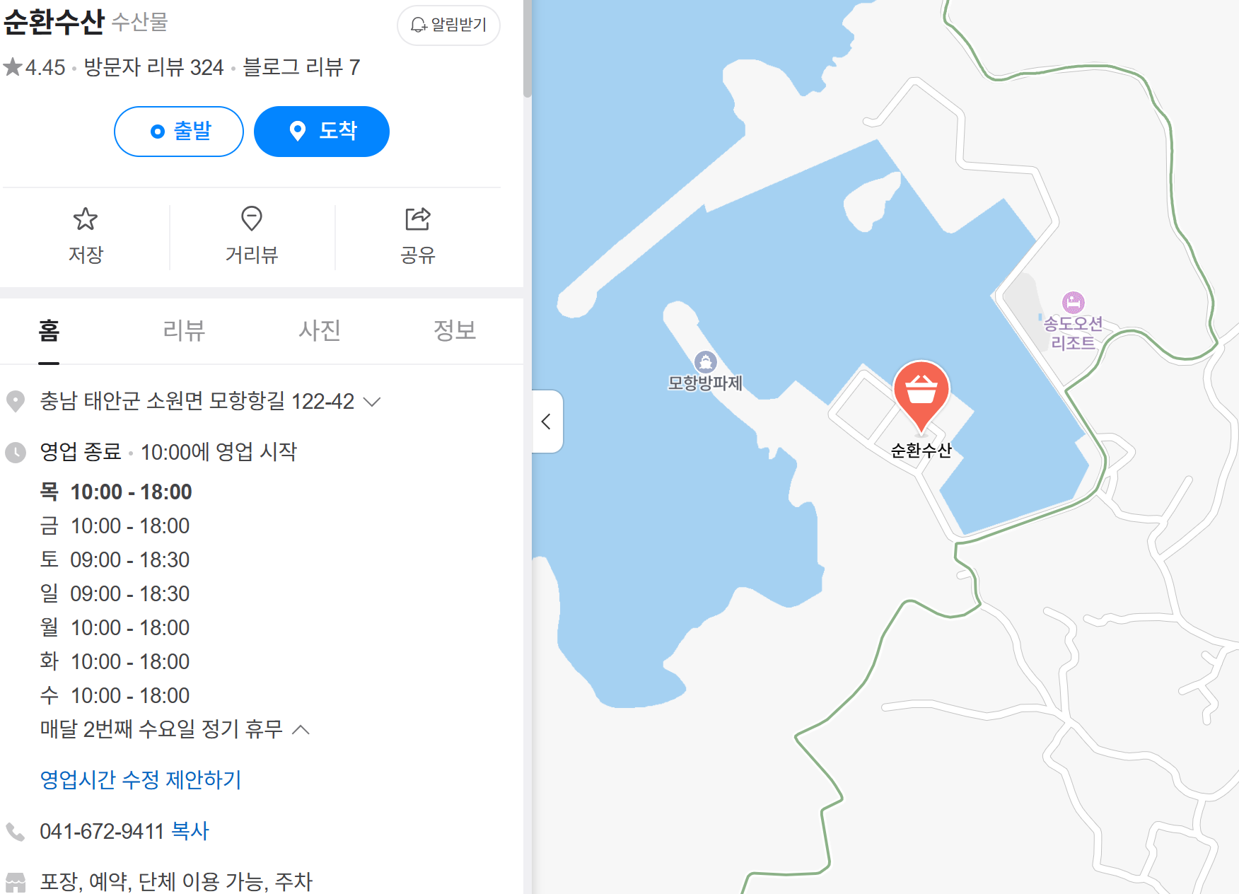 태안군 안면읍소원면 모항항 수산물 직판장에 위치한 이곳은 바다를 배경으로 한 여유로운 수산시장 방문이 가능합니다.