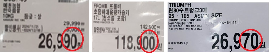 - **,*90원: 일반적인 정가로, 할인 없이 판매되는 가격입니다. 예를 들어 9,590원이나 26,790원과 같이 끝자리가 90원으로 표시되는것은 할인없이 정가 판매 제품임을 의미합니다.