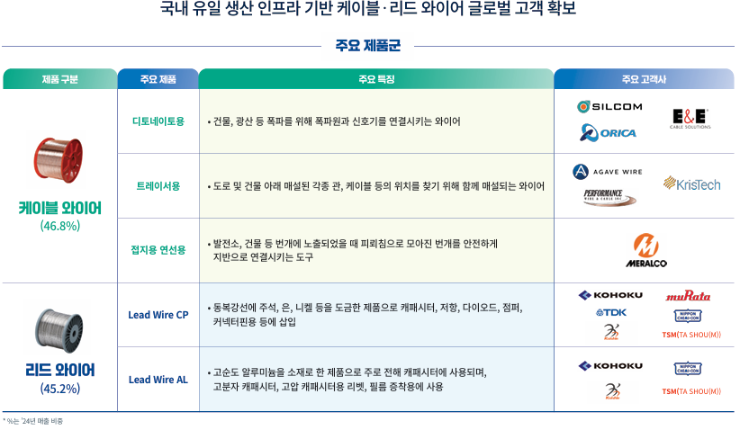 주요 제품 비중(2024년 기준)은 리드 와이어 46.8%, 케이블 와이어 45.3%, 기타 매출 7.9%
