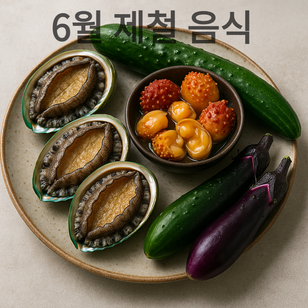 6월에는 전어, 멍게, 키조개, 전복 같은 해산물이 제철입니다.